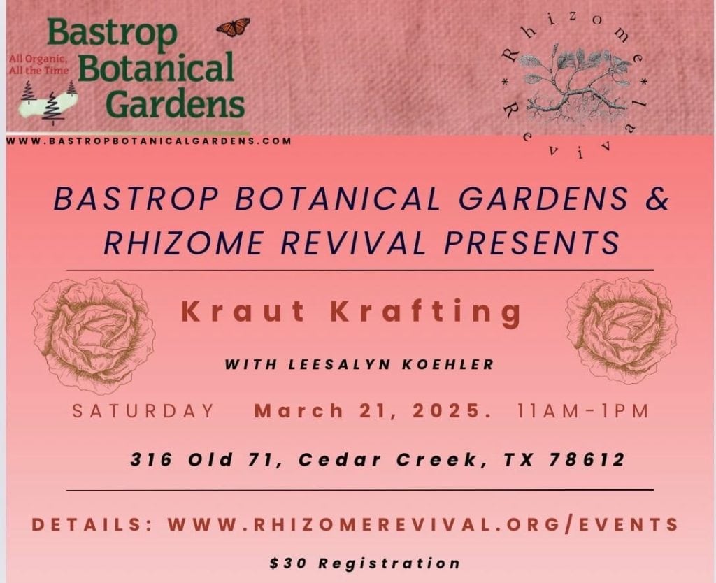 Join us on Saturday, March 21st, from 11:00 a.m. to 1:00 p.m. Always informative and fun herbal classes with Leesalyn Ramapriya Koehler of Rhizome Revival Educational Farm teaching at Bastrop Botanical Gardens. 💚